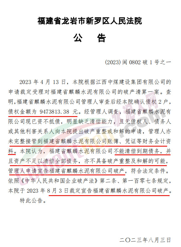 8月3日,福建省龍巖市新羅區(qū)人民法院發(fā)布公告稱:2023年4月13日,根據(jù)江西中煤建設(shè)集團(tuán)有限公司的申請裁定受理對福建省麒麟水泥有限公司的破產(chǎn)清算一案。