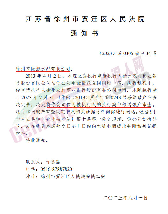 法院執(zhí)行局于2023年7月31日作出(2013)賈執(zhí)字第0243號移送破產(chǎn)審查決定書,決定將徐州市隆源水泥有限公司作為被執(zhí)行人的執(zhí)行案件移送破產(chǎn)審查。