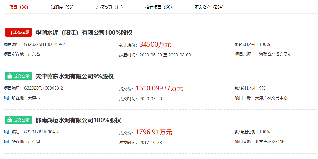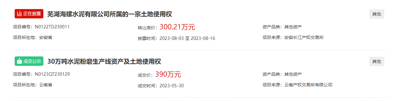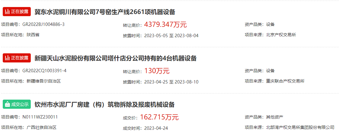 另有包含華潤水泥、冀東水泥、萬年青水泥在內(nèi)的4家品牌企業(yè)公開出讓企業(yè)股權(quán);包含行業(yè)知名企業(yè)蕪湖海螺水泥在內(nèi)的兩家企業(yè)公開出讓土地使用權(quán);包含天山水泥、中聯(lián)水泥、南方水泥、北方水泥、冀東水泥在內(nèi)的14家企業(yè)公開出讓熟料生產(chǎn)線、熟料指標(biāo)、房屋建筑物、構(gòu)筑物及機(jī)器設(shè)備等資產(chǎn)。
