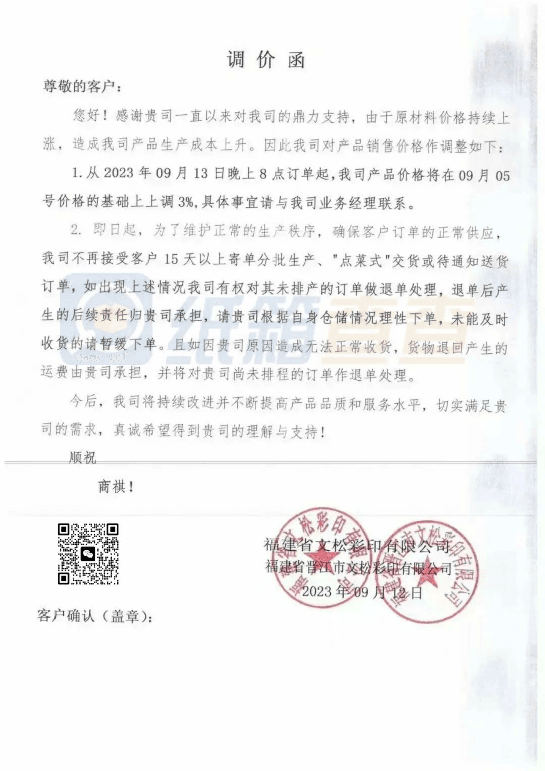 福建省文松彩印:從9月13日晚上8點訂單起,再上調3%。