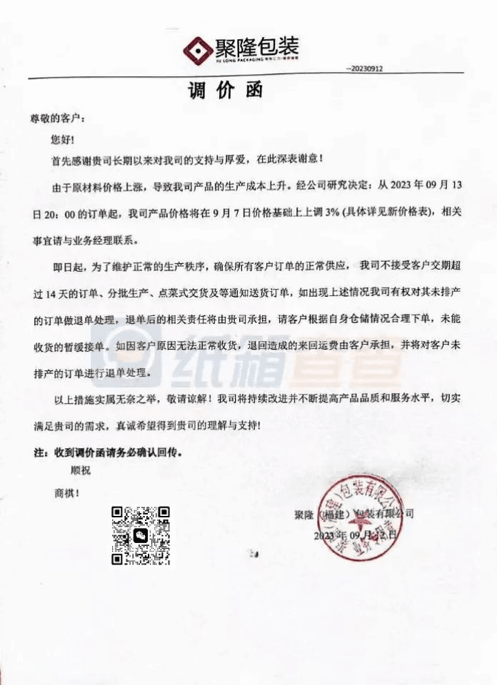 聚隆(福建)包裝:從2023年9月13日20:00的訂單起,將在9月7日價格基礎上上調3%。