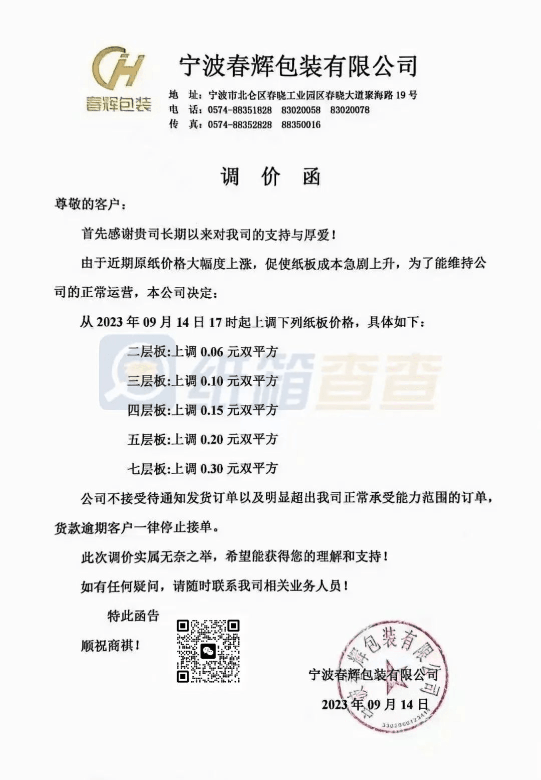 寧波春輝包裝:從2023年9月14日17時起,具體如下:二層板:上調0.06元雙平方;三層板:上調0.10元雙平方四層板:上調0.15元雙平方五層板:上調0.20元雙平方;七層板:上調0.30元雙平方。