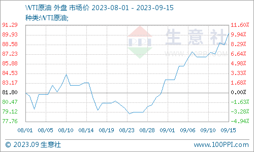 沙特持續減產,今年第四季度全球石油市場將面臨每天超過300萬桶的供應缺口,9月14日,國際原油期貨上漲,漲幅明顯。美國WTI原油期貨主力合約結算價報90.16美元/桶,漲幅1.64美元或1.9%。今年WTI首次站上90美元關口,創2022年11月以來新高。8月23日以來,WTI原油價格階段性大漲14.4%。