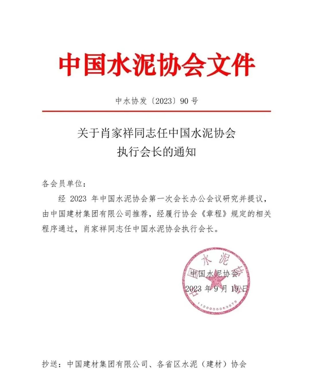 日前,中國水泥協會發布《關于肖家祥同志任中國水泥協會執行會長的通知》稱,經2023年中國水泥協會第一次會長辦公室研究并提議,由中國建材集團有限公司推薦,經履行協會《章程》規定相關程序通過,肖家祥同志任中國水泥協會執行會長。