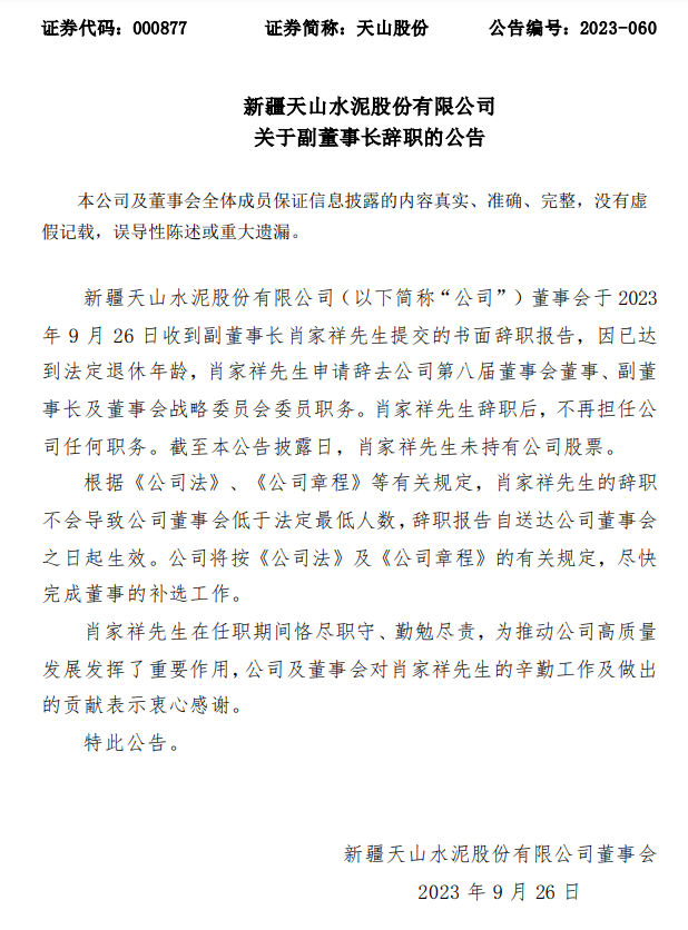 天山股份9月26日晚間發(fā)布公告稱,新疆天山水泥股份有限公司董事會于2023年9月26日收到副董事長肖家祥先生提交的書面辭職報告,因已達到法定退休年齡,肖家祥先生申請辭去公司第八屆董事會董事、副董事長及董事會戰(zhàn)略委員會委員職務(wù),不再擔任公司任何職務(wù)。