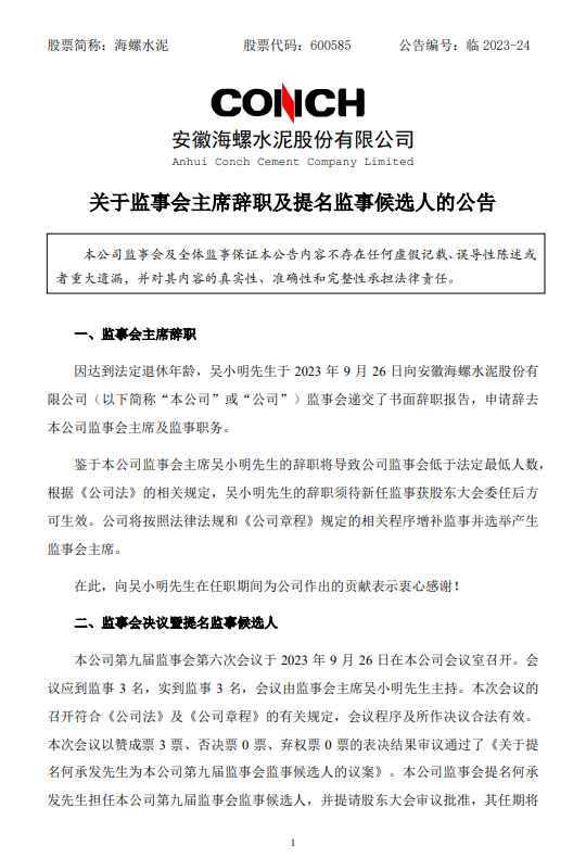 海螺水泥公告稱,因達到法定退休年齡,吳小明先生于2023年9月26日向安徽海螺水泥股份有限公司監(jiān)事會遞交了書面辭職報告,申請辭去本公司監(jiān)事會主席及監(jiān)事職務(wù)。