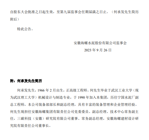 海螺水泥:監(jiān)事會主席吳小明辭職,何承發(fā)接任
