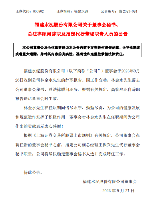 福建水泥發(fā)布公告稱,董事會于2023年9月26日收到公司林金水先生的辭職報告。因工作變動,林金水先生辭去公司董事會秘書、總法律顧問職務(wù)。根據(jù)有關(guān)規(guī)定,高管辭職自辭職報告送達董事會時生效。